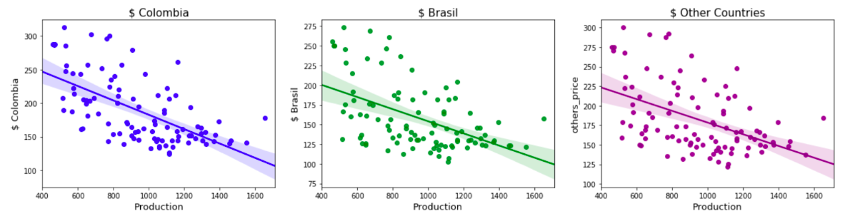As you can see in the picture above, there seems to be a big negative relation between price of Coffee, in Colombia, Brazil or other countries, and the Production volume. Does this majes sense? Do lower prices lead to higher production volume? Actually, is the other way around: Higher volumes will make prices go lower, and low production will make the coffee more expensive. If you think about it, this is simple offer and demand theory.