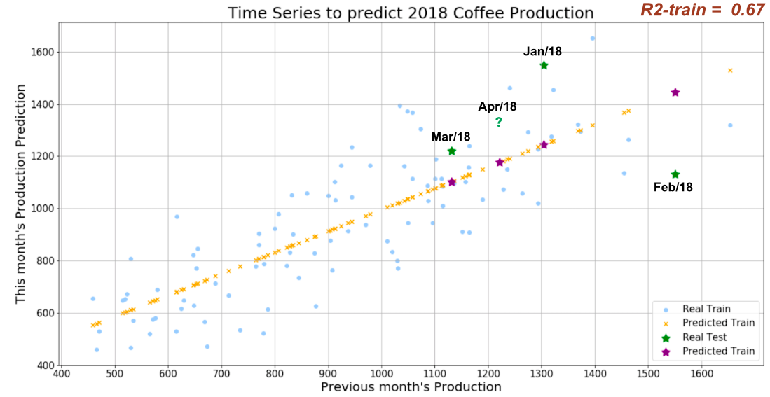 Results: R2(test) improved to 0.67. Below you can see an image of the predictions using only previous-month-production as feature: You can see that last months predictions (Purple starts, labeled Jan through March) are very close from the real values (Green stars). This model predicts for next month, a coffee production of 1.176 thousand bags, well just have to wait and see the results. The model improved so I’ll include previous-month-production as a feature in the model