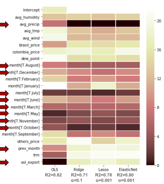 Economical facts from international competidors such as Brazil, Vietnam, Peru and Mexico, don’t seem to affect either. The production of these countries, along with Colombia, seem to be influenced all in paralell by other external features in common not included in this analysis.
